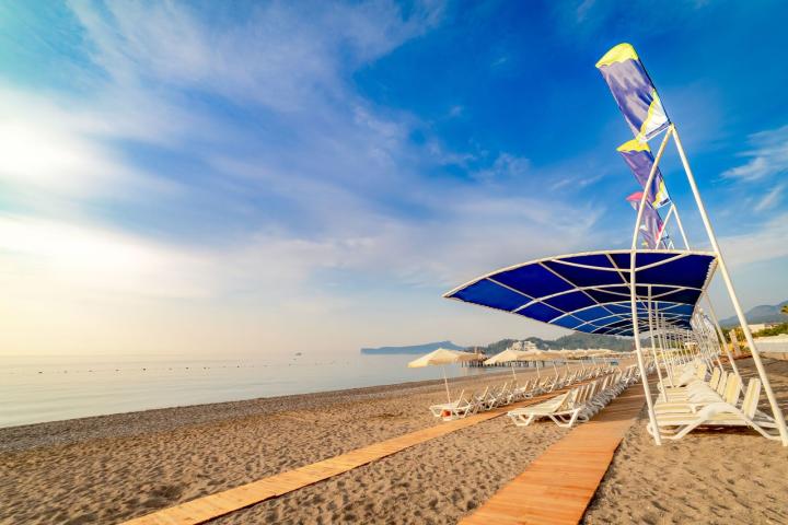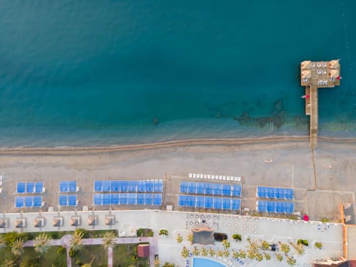 Hotel ima svoju peščano-šljunkovitu plažu dužine 150m, upotreba suncobrana i ležaljki je besplatna za goste hotela.
