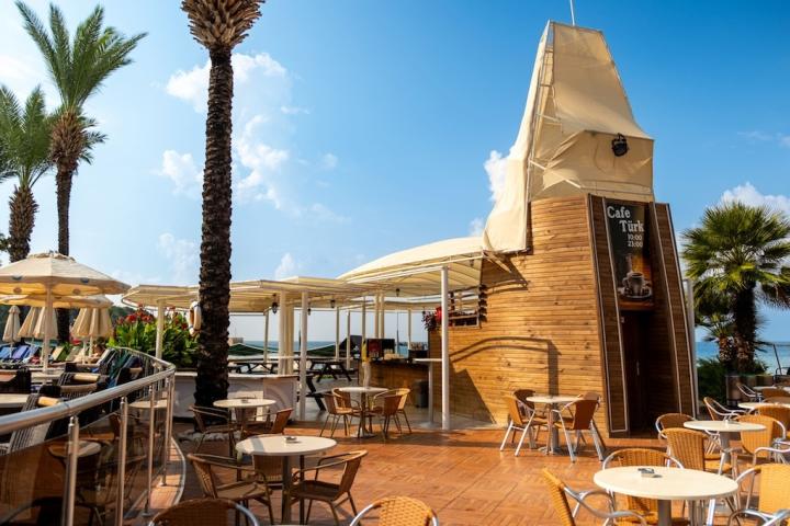 Usluga u hotelu je All Inclusive - doručak, kasni doručak, ručak, večera (samoposluživanje - izbor više jela po hotelskim pravilima). U konceptu su užine i lokalna alkoholna i bezalkoholna pića. Hotel u ponudi ima glavni restoran Olympos i nekoliko barova - Lobby Bar, Pool Bar, Beach Bar, Lobby Lounge i Disco.