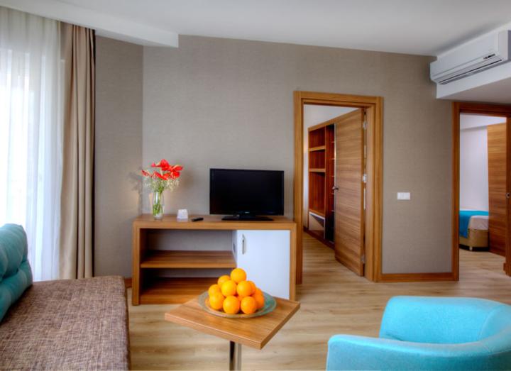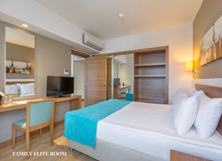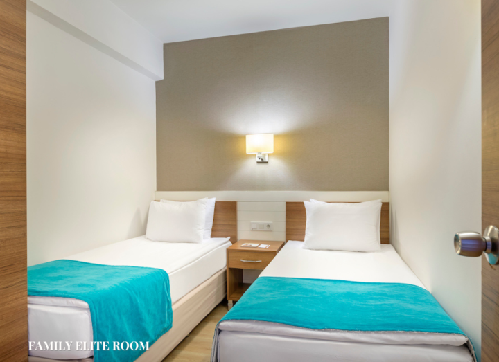 Family elite room površine je 50m². Sastoji se od dve odvojene spavaće sobe i dnevne sobe. U jednoj spaćoj sobi se nalazi francuski ležaj, u drugoj dva odvojena ležaja, a u dvnevnoj sofa. Za smeštaj maksimalno 6 osoba. Imaju balkon.