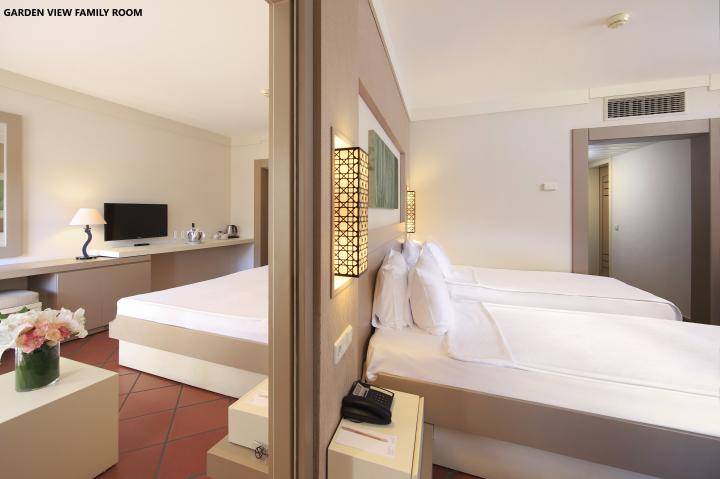 Garden view family soba ima površinu 62m2 i sastoji se od dve spojene sobe tako da ima dva kupatila i dve terase.