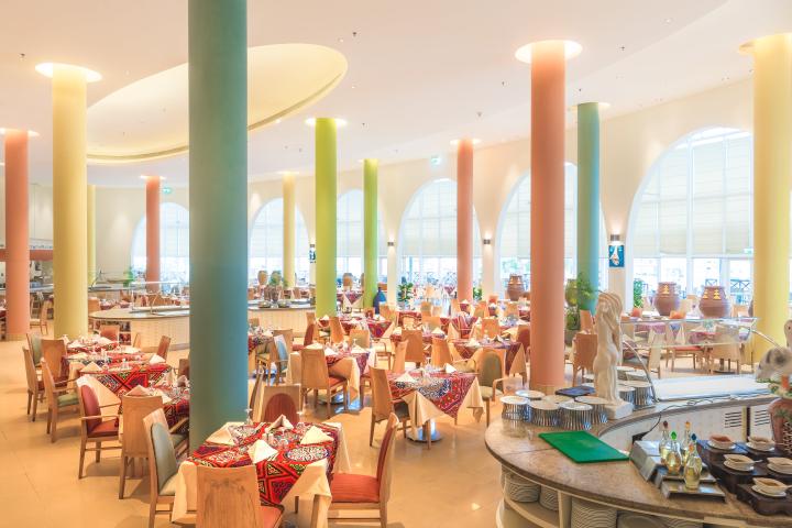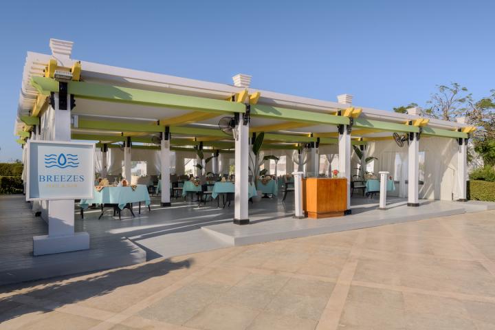 Usluga u hotelu je All Inclusive - doručak, ručak i večera (samoposluživanje - izbor više jela po hotelskim pravilima). U konceptu su užina, sladoled, lokalna alkoholna i bezalkoholna pića. Hotel u ponudi ima pored glavnog restorana - Marsa (glavni restoran) i 3 a la carte restorana Breezes (orijentalna kuhinja) , Nuba (italijanski) i Amasis (seafood).  Gostima su na raspolaganju i nekoliko barova: Coral beach, Breezes pool, Axis bar, Souk cafe & Shisha corner, Bedouin tent.