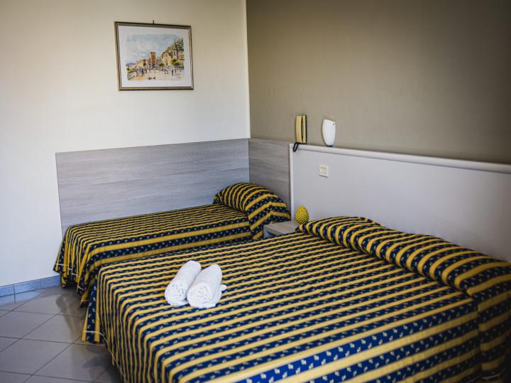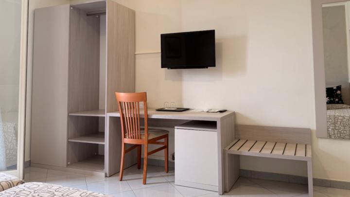 Hotel raspolaže sa 34 smeštajne jedinice raspoređene na tri sprata, uz lift. Sve sobe su klimatizovane i imaju terasu ili balkon, TV, sef, mini bar, Wi-Fi (agencija ne može uticati na brzinu i jačinu signala), kao i kupatilo sa tušem, peškirima i fenom za kosu. Krevetac je dostupan na upit, uz doplatu od oko 10 € po noći.