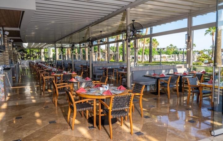 Samoposluživanje, izbor više jela po hotelskim pravilima u glavnom restoranu: doručak, à la carte doručak, kasni doručak, ručak, večera, ponoćna užina, kolači, užine u različito doba dana, lokalna alkoholna i bezalkoholna pića, kokteli, restoran (jednom nedeljno uz rezervaciju dan unapred). U restoranima „Akdeniz“ i "Tirmis" nije dozvoljen ulaz deci ispod 12 godina.
