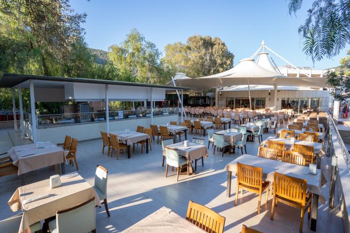 Usluga u hotelu je All Inclusive - doručak, kasni doručak, ručak, večera i ponoćna užina u glavnom restoranu (samoposluživanje - izbor više jela prema hotelskim pravilima). Pored glavnog restorana hotel ima i riblji à la carte restoran, Lobby bar, Pool bar, Snack restoran. U koncept usluge su uključeni obroci u glavnom restoranu, užine i poslastice tokom dana u određeno vreme na određenim lokacijama u okviru hotelskog kompleksa, sva alkoholna i bezalkoholna domaća pića. All inclusive koncept traje 24h (Lobby bar).