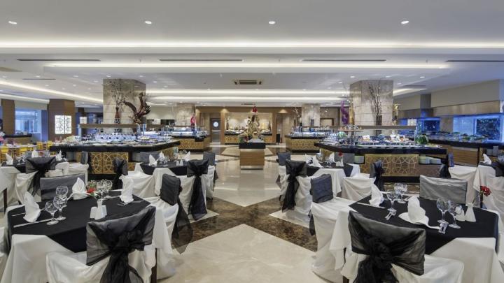 Usluga u hotelu je High Class All Inclusive - doručak, kasni doručak, ručak, večera (samoposluživanje - izbor više jela po hotelskim pravilima). Hotel u ponudi ima nekoliko a la carte restorana (besplatno jednom u toku boravka od minimum sedam dana) -Viccolo (italijanski restoran), Coral (specijaliteti sa morskim plodovima), Sadirvan (turska kuhinja), Mikado (dalekoistočna kuhinja) i Taco (meksička kuhinja). U ponudi je i nekoliko barova - Lobby Bar, Pool Bar, Beach Bar, Select Villa Pool Bar i Disko bar. U konceptu su i ponoćne užine, kafa, kolači, sendviči, sladoled, palačinke i lokalna alkoholna i bezalkoholna pića.
