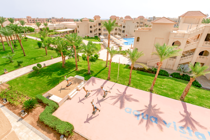 Aqua Vista Resort je otvoren u januaru 2008. a poslednji put renoviran 2017. godine. U ponudi ima 326 smeštajnih jedinica. Okružen je hotelima Beach Albatros Resort, Albatros Aqua Park i Aqua Blu, čije bazene gosti mogu da koriste.