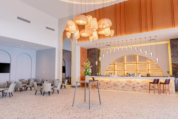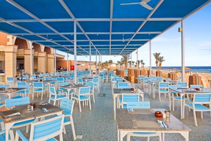 Usluga u hotelu je All Inclusive - doručak, ručak i večera (samoposluživanje - izbor više jela po hotelskim pravilima). U konceptu su užine i lokalna alkoholna i bezalkoholna pića. Hotel sadrži i nekoliko restorana, Shell Fish - a la carte restaurant, El Khan - restoran orijentalne kuhinje, Bella Chicken, Soprano Restaurant - restoran italijanske kuhinje, Mediterranean Restaurant, Lounge Restaurant, Taj Restaurant - restoran azijske kuhinje. I nekoliko bara, Lobby Bar, Terracce Bar, 3 Pool Bars, Red Sky Bar, Habiba Beach Bar, Sports Bar, Colombus Cafe, 2 Aqua Bars, Disco Bar, Blue Lounge i Beach Club novi sneck restoran gde gosti mogu uživati u raznim snekovima, svežem voću i sladoledu u različito doba dana.