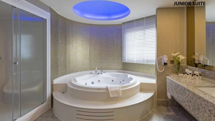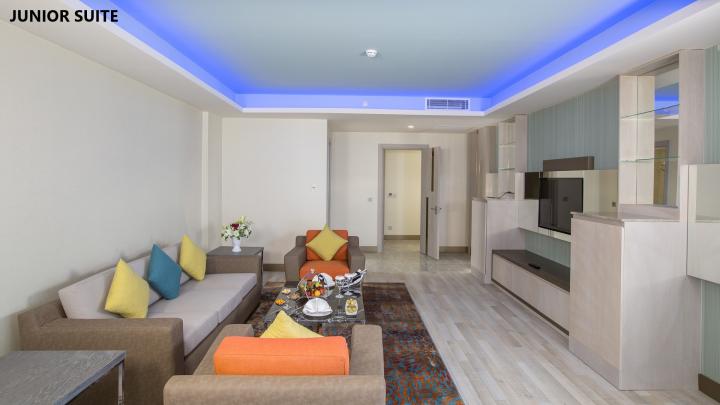 Junior suite je površine 140m2 i sastoji se od jedne spavaće sobe i jedne dnevne sobe. Kupatilo je opremljeno tuš kabinom koja ima funkciju parnog kupatila , WC i jacuzzi-jem.