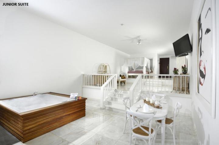Junior suite ima površinu 85m2, ima francuski krevet i deo za sedenje, sto za 4 osobe i jacuzzi.
