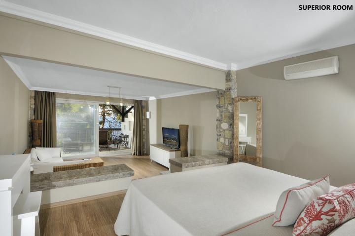 Superior soba ima površinu 40m2, ima francuski krevet i dnevni boravak sa garniturom za sedenje.
