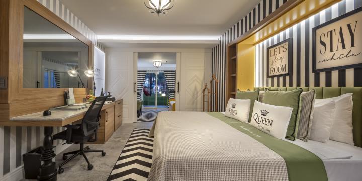 Hotel raspolaže sa 300 smeštajnih jedinica u glavnoj zgradi (9 spratova) i 100 smeštajnih jedinica u bungalovima. Sve sobe imaju balkon/terasu, jacuzzi, sef, LCD TV, fen za kosu, Wi-Fi internet, klima uređaj, ketler, mini bar (dopunjuje se svakoga dana). Luxury sobe imaju površinu 45-62m2.