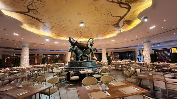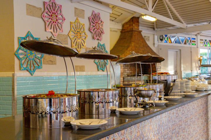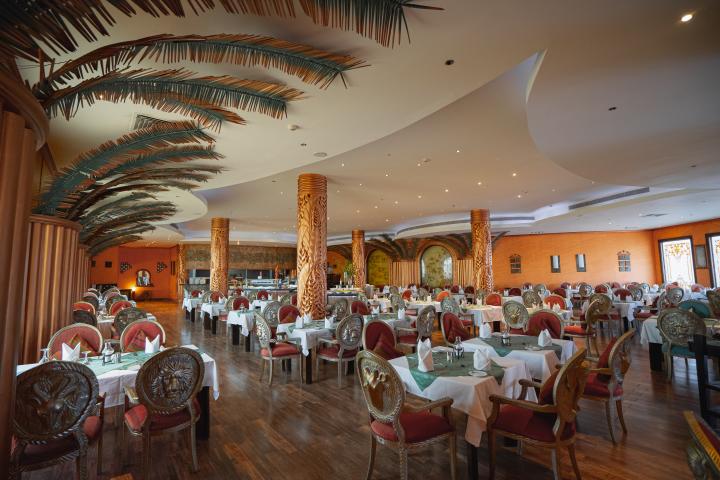 Usluga je All inclusive -  doručak, kasni doručak, ručak, večera (samoposluživanje – izbor više vrsta jela, po hotelskim pravilima). Pored glavnog restorana Caribbean, hotel ima 5 a' la carte restorana: Tortuga Beach Grill, Barbecue, La Palma i Fish Restaurant. Gostima je na raspolaganju i nekoliko barova - Cuba Beach Bar, Aladdin Cafe & Shisha Corner, Jamaica Pool Bar, Melody Gazebo Bar, Aloha Lobby Bar. Coco Loco Fresh Bar i Caribbean Disco & Lounge. U koncept su uključene i užine, sladoled, lokalna alkoholna i bezalkoholna pića.