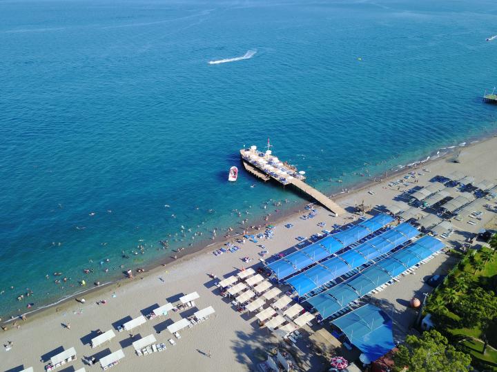 Hotel ima svoju peščano-šljunkovitu plažu udaljenu 400m od hotela. Prelazi se ulica do plaže.  Upotreba suncobrana, ležaljki i peškira se ne naplaćuje. Na plaži se nalazi snack restoran i beach bar.