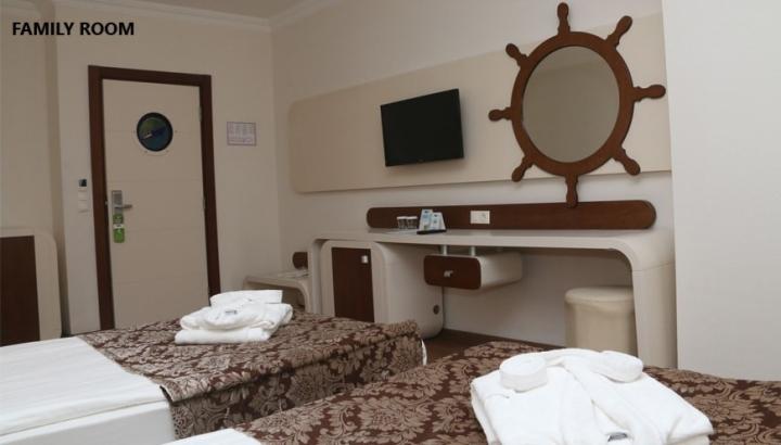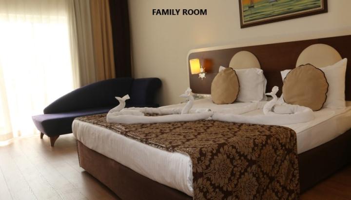Porodična soba je veličine 56-60 m²  (dve sobe, u jednoj sobi se nalazi francuski ležaj a u drugoj dva single ležaja, jedno kupatilo).