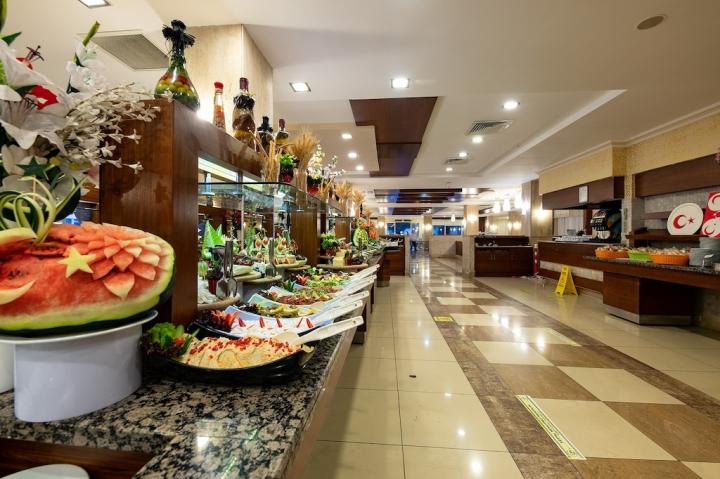U hotelu je usluga  All inclusive – samoposluživanje, izbor više jela u glavnom restoranu: doručak, kasni doručak, ručak, večera. U koncept su još uključene užine, sladoled ( 16.30-17.00h),lokalna alkoholna i bezalkoholna pića. Gostima je dostupan a’la carte restoran jednom u toku boravka ( plaća se 2 eur po odrasloj osobi) uz prethodnu rezervaciju.