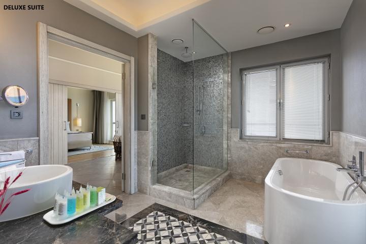 Deluxe suite -  je površine 80m2 sastoji se od  spavaće sobe sa francuskim krevetom i  prostorije za sedenje sa dve sofe, kupatila i balkona.